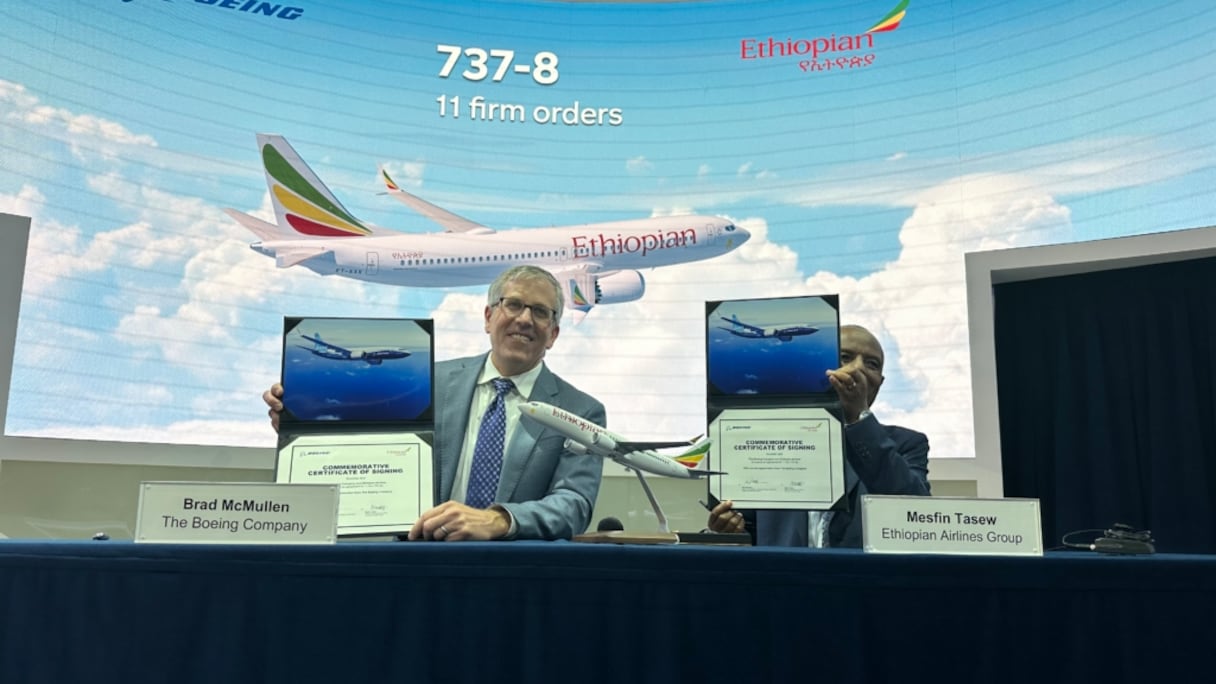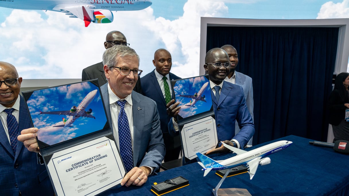 Dès l’ouverture du salon, trois commandes d’avions ont été enregistrées chez les compagnies aériennes africaines. En premier lieu, Air Sénégal a passé une commande ferme de neuf Boeing 737 Max, assortie d’une option pour six autres appareils supplémentaires. La cérémonie de signature s’est déroulée en présence du ministre sénégalais des Infrastructures et des Transports terrestres et aériens, Yankhoba Diémé, et de Brad McMullen, Senior vice-président of global sales and marketing de Boeing.