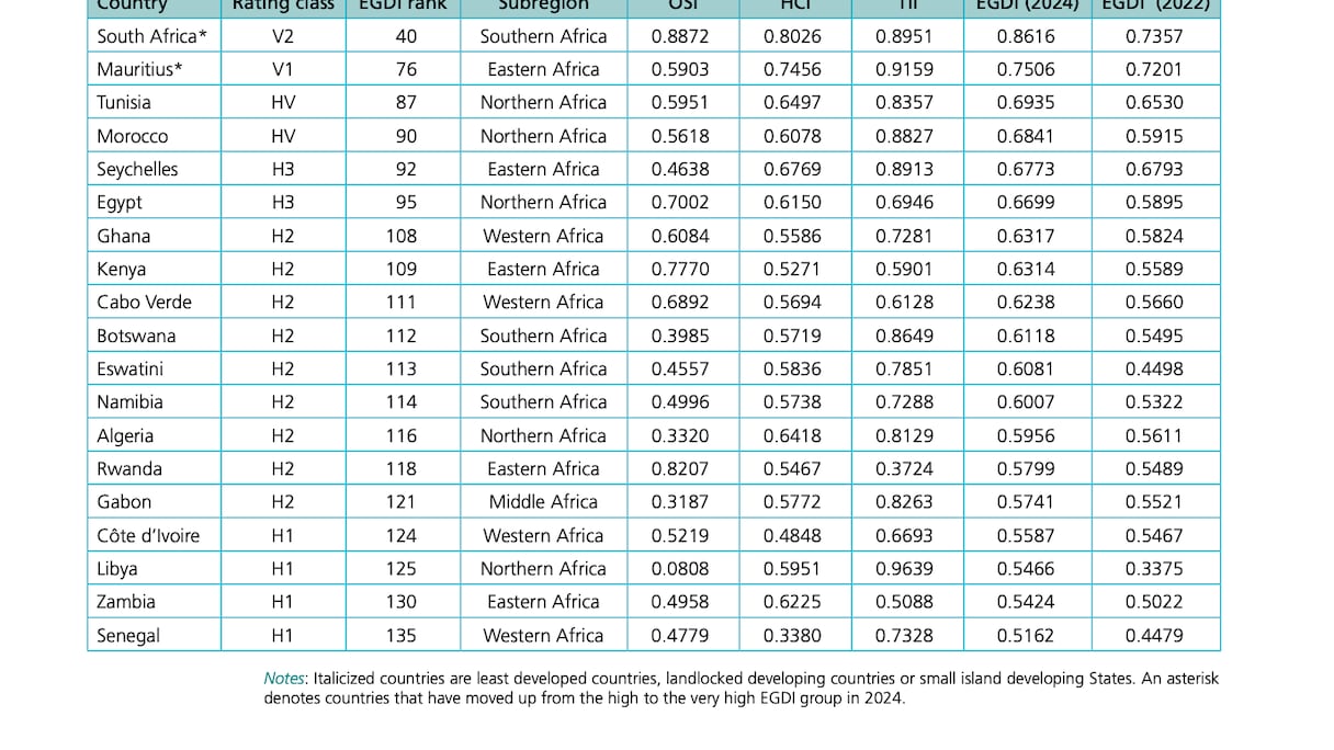 Toutefois, plusieurs pays africains ont réalisé d’importants progrès ces dernières années réduisant fortement leur fracture numérique avec les pays développés. C’est le cas de l’Afrique du Sud, de Maurice, de la Tunisie, du Maroc, des Seychelles et de l’Égypte qui figurent dans le Top 100 mondial de l’EGDI. Ces pays, hormis l’Égypte, ont des scores supérieurs à la moyenne mondiale.