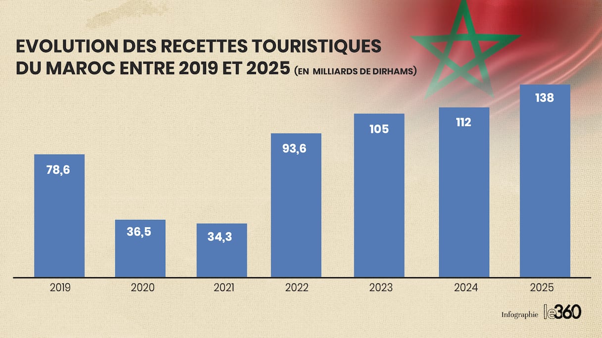 Le tourisme marocain a bouclé 2025 avec une performance historique en engrangeant des recettes s’établissant à 138,10 milliards de dirhams, soit 14,70 milliards de dollars (au cours moyen de 9,4 dirhams pour 1 dollar en 2025). Celles-ci sont en hausse de 20,60% par rapport à celle de l’année précédente. Grâce à cette performance, le Maroc dépasse son objectif fixé pour fin 2026 (120 milliards de dirhams inscrit dans la feuille de route 2023-2026), confirmant la montée en puissance du tourisme marocain sur la scène touristique mondiale.