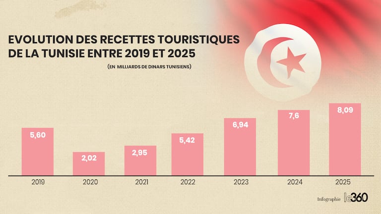 Avec des arrivées de touristes qui ont dépassé pour la première fois la barre des 11 millions, les recettes ont battu un record en 2025. Selon les données de la Banque Centrale de Tunisie (BCT), les recettes touristiques se sont établies à 8.096,9 millions de dinars tunisiens, soit 2,745 milliards de dollars, contre 7.599,7 millions en 2024, affichant une progression de 6,5%. Une hausse qui atteste de la dynamique du secteur touristique tunisien qui continue de battre des records.