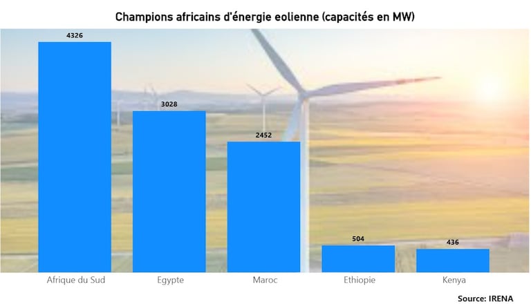 L’Afrique pèse à peine 0,9% des capacités éoliennes installées dans le monde. Cinq pays (Afrique du Sud, Egypte, Maroc, l'Ethiopie et la Kenya) concentrent 93,70% des capacités éoliennes installées en Afrique.
