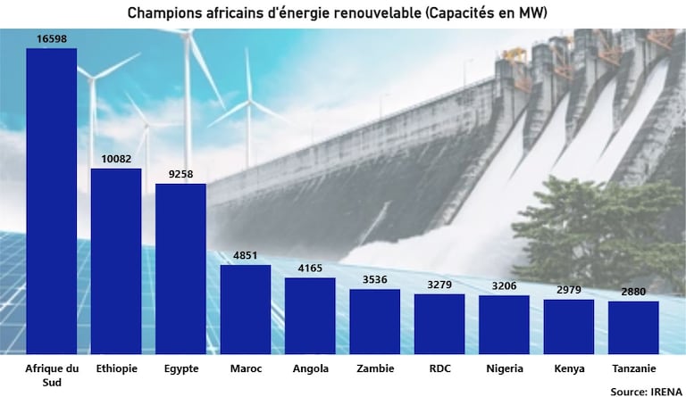 Énergies renouvelables: les capacités installées en Afrique s'établissent à 82.371 mégawatts (MW), soit 1,6% des capacités installées au niveau mondial. Le potentiel des énergies renouvelables estimé à 10 térawatts (10 millions de mégawatts).