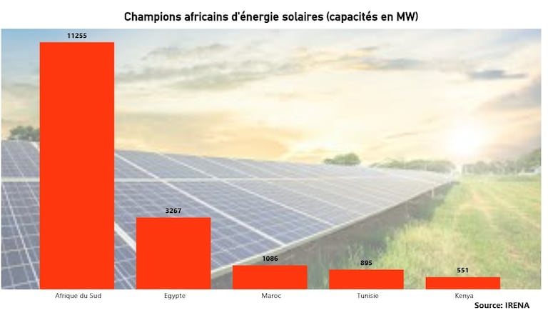 L’Afrique représente 0,93% des capacités solaires installées dans le monde. Cinq pays (Afrique du Sud, Égypte, Maroc, Tunisie et Kenya) concentrent 76,86% des capacités solaires installées en Afrique.