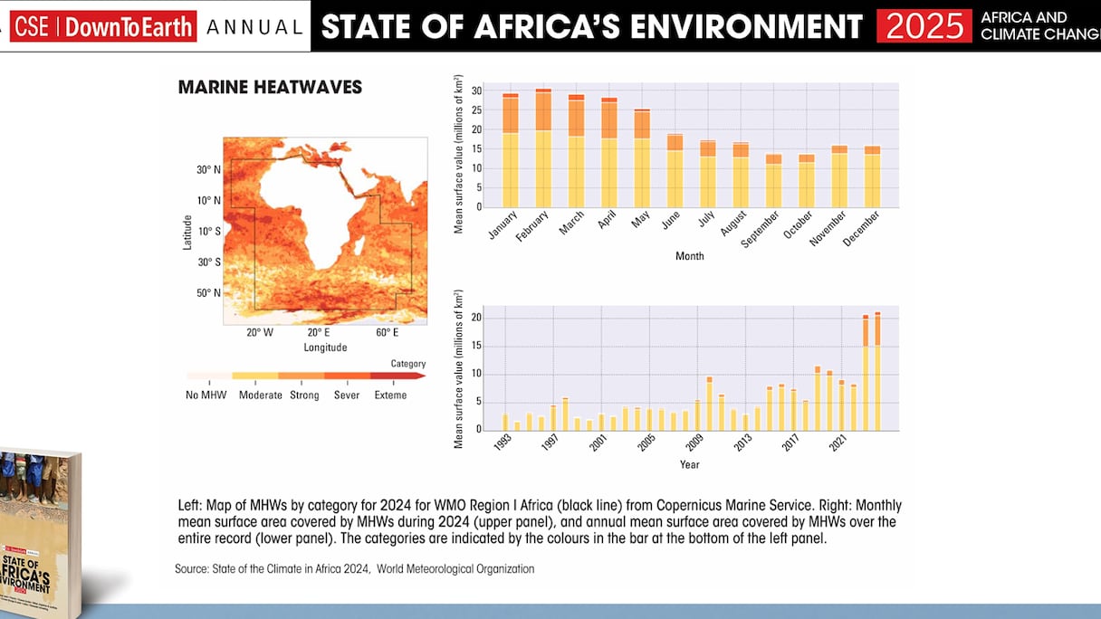 Au niveau mondial, les niveaux de dioxyde de carbone ont atteint leur plus haut niveau depuis 800.000 ans. L’année 2024 a, pour la première fois, dépassé le seuil compris 1,5 et 2°C fixé par l’Accord de Paris, au-delà duquel les impacts seraient irréversibles. Les huit dernières années ont été les plus chaudes jamais enregistrées, avec des vagues de chaleur marine affectant presque toutes les régions côtières africaines. Les océans se réchauffent désormais à un rythme sans précédent, menaçant la biodiversité et les moyens de subsistance de millions de personnes.