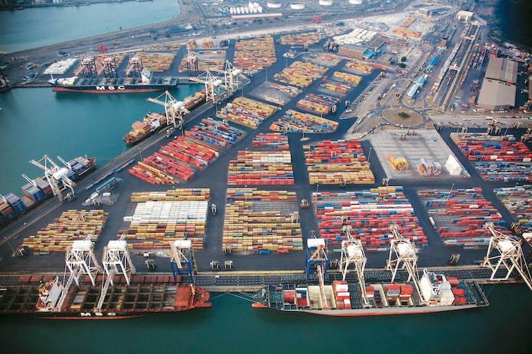Vue aérienne du port Tanger Med, première infrastructure portuaire d'Afrique avec 11,1 millions de conteneurs traités en 2025. Le port se prépare à gérer un afflux de trafic supplémentaire lié aux déroutements via le cap de Bonne-Espérance, tout en prévenant les risques de congestion que l'augmentation des escales pourrait engendrer.