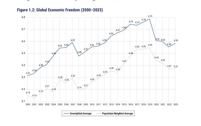 L'évolution de la note moyenne de l'indice des libertés économiques de Fraser Institute de 2000 à 2023.