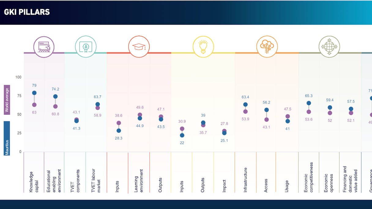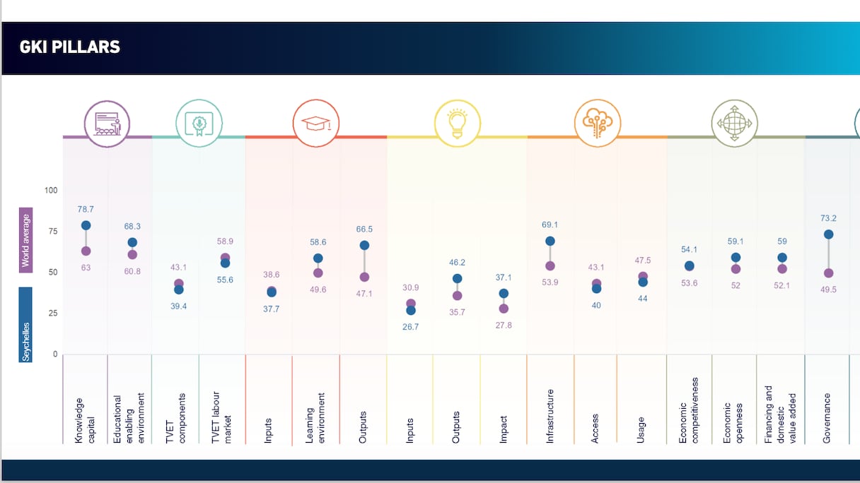 «Les Seychelles sont très performantes en termes d’infrastructures de connaissances et se classent 45e sur 141 pays dans le Global Knowledge Index 2024 et 44e sur 59 pays à très haut développement humain», lit-on dans le rapport. L’archipel, avec un score de 52,97, devance des pays comme la Grèce, la Chine… Il doit son rang à ses performances au niveau des piliers Enseignement supérieur (31e mondial, score de 54,27), Economie (47e mondial avec un score de 57,38), Éducation pré-universitaire (44e mondial avec un score de 73,48). Le pays est handicapé par le pilier Enseignement technique et professionnel et formation qui le positionne au 92e rang mondial avec un score de 47,47.