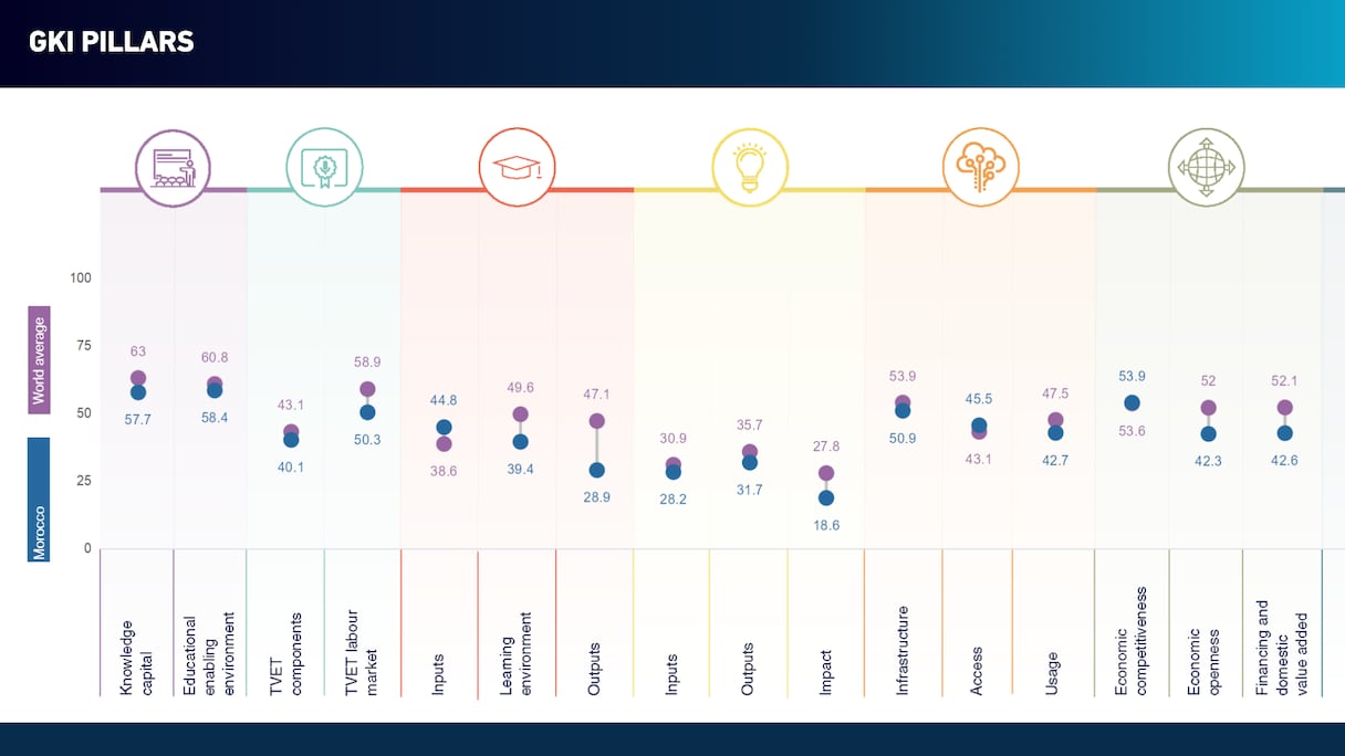 Les notes du Maroc au niveau des différents critères par rapport à la moyenne mondiale.. Global Knowledge Index