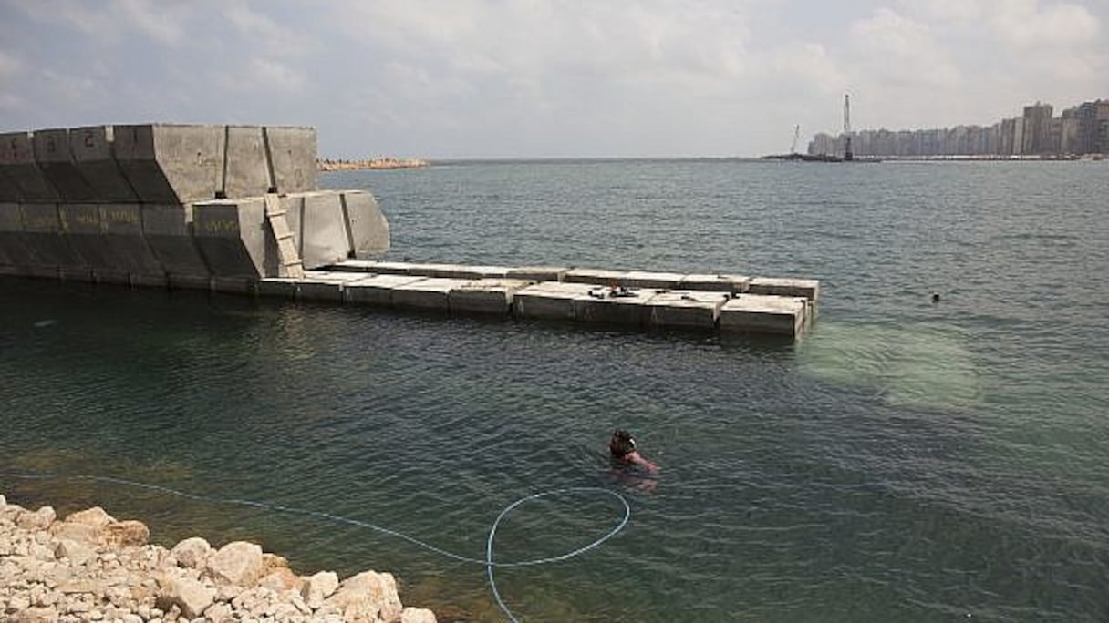 Un ouvrier en tenue de plongée se prépare à placer des blocs de ciment pour empêcher la montée des eaux près de la corniche d'Alexandrie, en Égypte, le 8 août 2019. Les pays comme l'Égypte, le Soudan, l'Érythrée, Djibouti et la Somalie sont en première ligne, avec une hausse de 4,1 mm par an. Les villes balnéaires égyptiennes et les zones agricoles du delta du Nil sont particulièrement menacées.