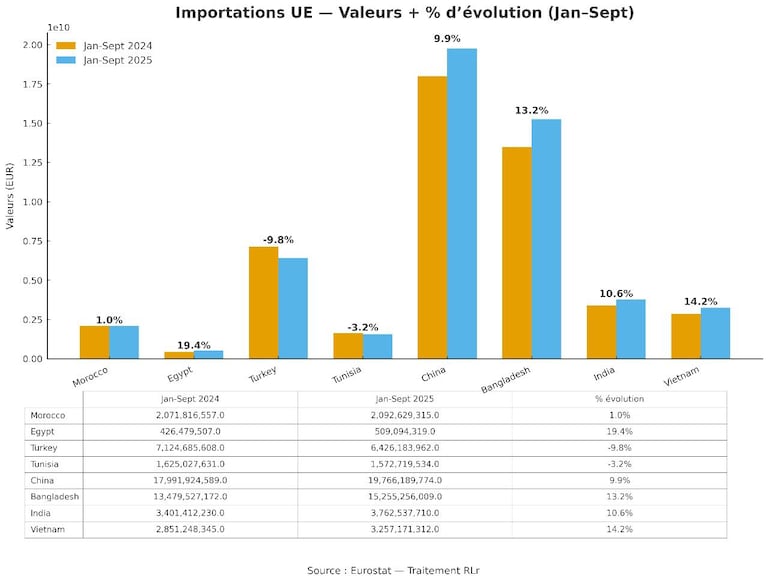 Après le bond de 12,3% des importations européennes de textile-habillement au terme du premier semestre 2025, la tendance se confirme à fin septembre 2025 avec une croissance structurelle tirée par l’offensive asiatique. Les dernières données Eurostat à fin septembre 2025, relayées par l’Association Marocaine des Industries de Textile et de l’Habillement (AMITH) révèlent des hausses soutenues des principaux fournisseurs: Bangladesh (+13,2% à 15,25 milliards d’euros), Chine (+9,9% à 19,76 milliards d’euros) et Vietnam (+14,2% à 3,25 milliards d’euros).