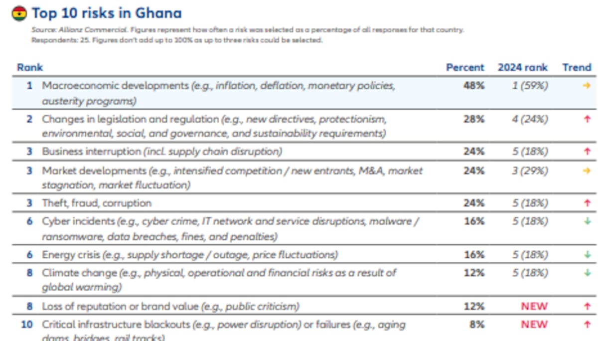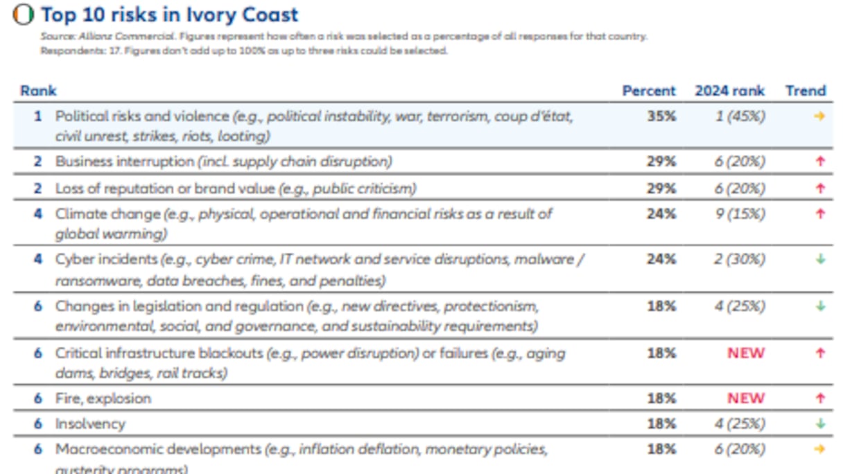 Pour ce qui est de la Côte d’Ivoire, les risques politiques et la violence (35%) constituent la principale menace identifiée pour 2025, maintenant leur première position de 2024. Une persistance qui témoigne d’un environnement politique et sécuritaire fragile dans le pays.