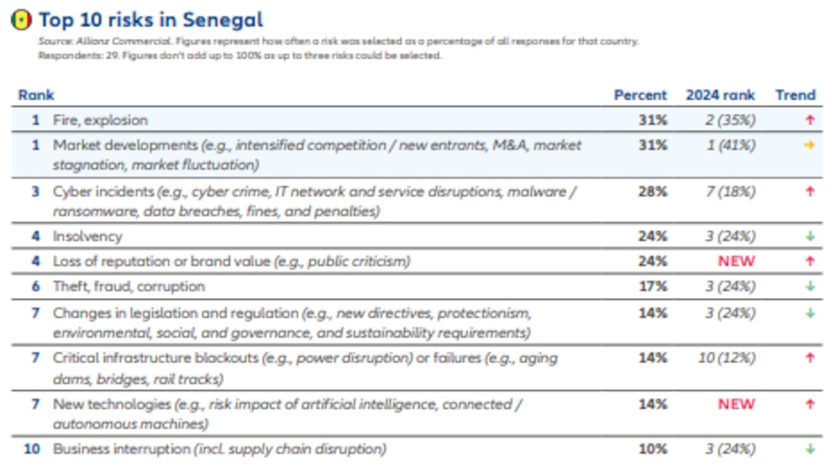 Au Sénégal, les risques liés aux incendies/explosions (31%) et aux évolutions du marché (31%) arrivent ex-æquo en tête des préoccupations pour 2025. Un classement qui marque une certaine stabilité par rapport à 2024, où ces mêmes risques occupaient déjà les premières places.