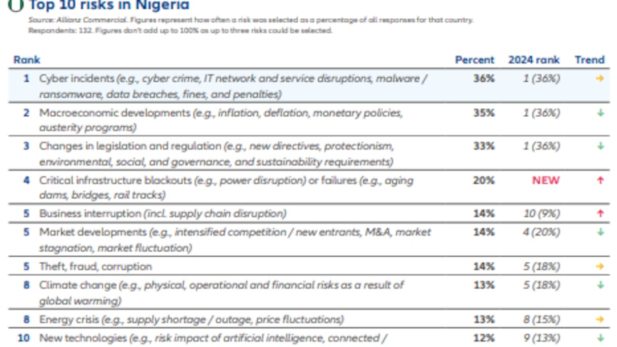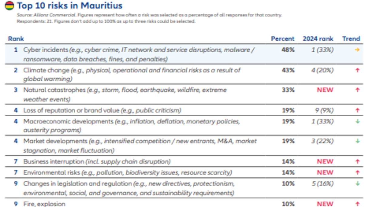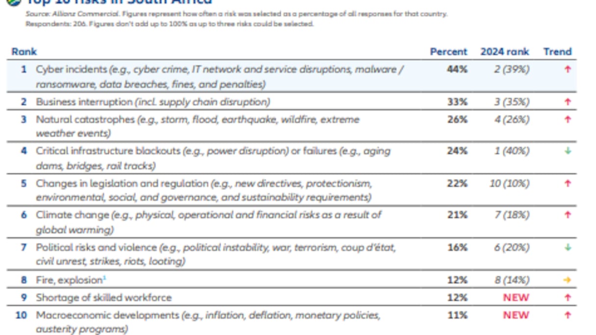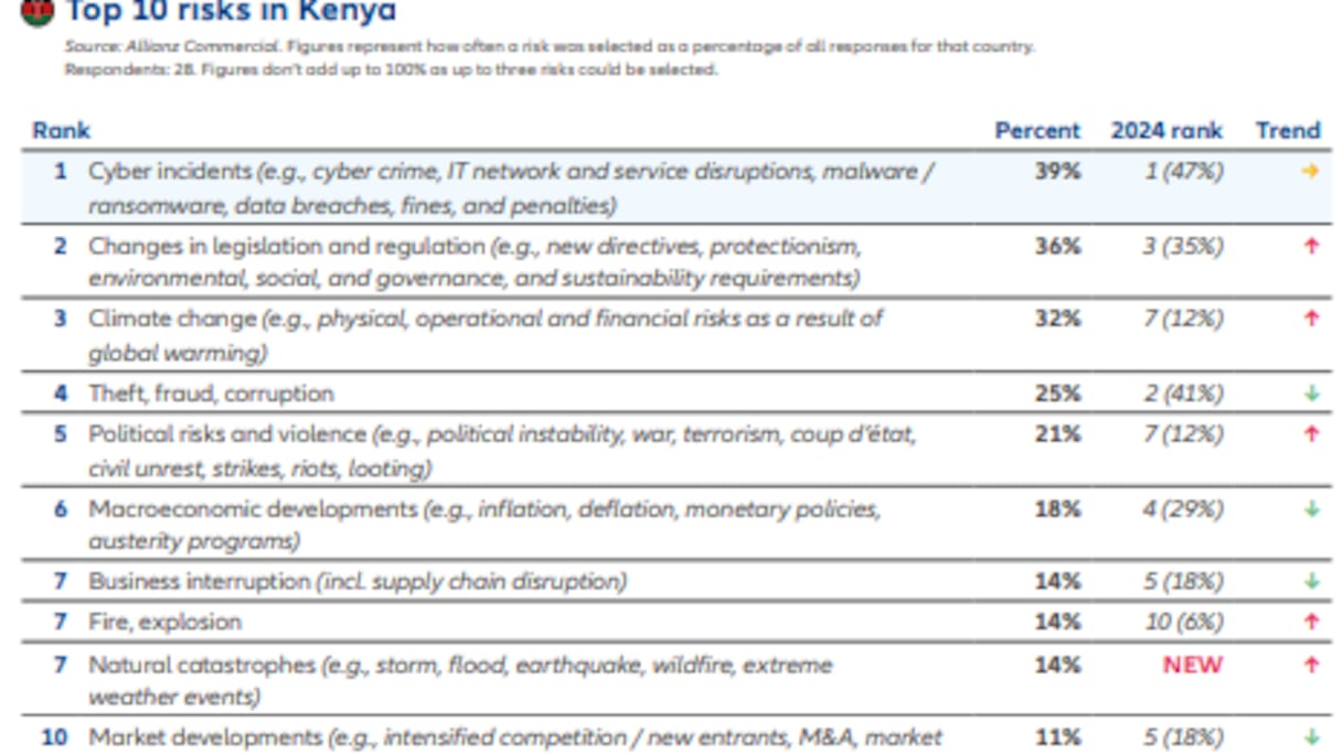 Toujours en Côte d’Ivoire, les interruptions d’activité (29%) et la perte de valeur de marque (29%) émergent comme de nouvelles priorités pour 2025. Le changement climatique (24%) et les cyberincidents (24%) complètent les principaux défis à relever. Un palmarès qui reflète les défis multidimensionnels auxquels sont confrontées les entreprises africaines en 2025.