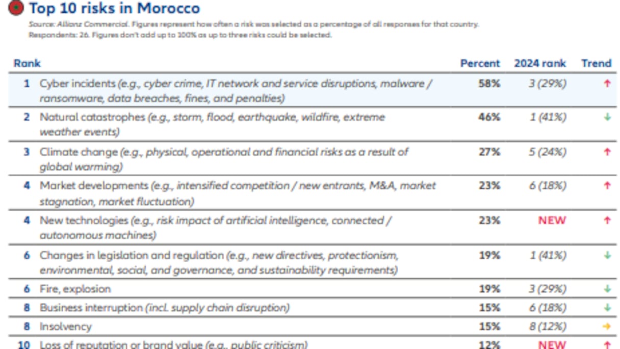 Au Maroc, les cyberincidents constituent la principale préoccupation des entreprises pour 2025, avec 58% des réponses. Soulignons que ce risque était seulement classé 3ème en 2024. Une tendance qui reflète l’environnement numérique en constante évolution et la nécessité accrue de se prémunir contre les cybermenaces telles que le cybercrime, les perturbations des réseaux informatiques et les violations de données. Les catastrophes naturelles (46%) et le changement climatique (27%) occupent respectivement la 2ème et 3ème place des risques les plus redoutés par les entreprises questionnées au Maroc. Le Maroc reste sensible aux aléas météorologiques extrêmes, comme en témoigne la 1ère place accordée aux catastrophes naturelles dans le rapport de 2024.