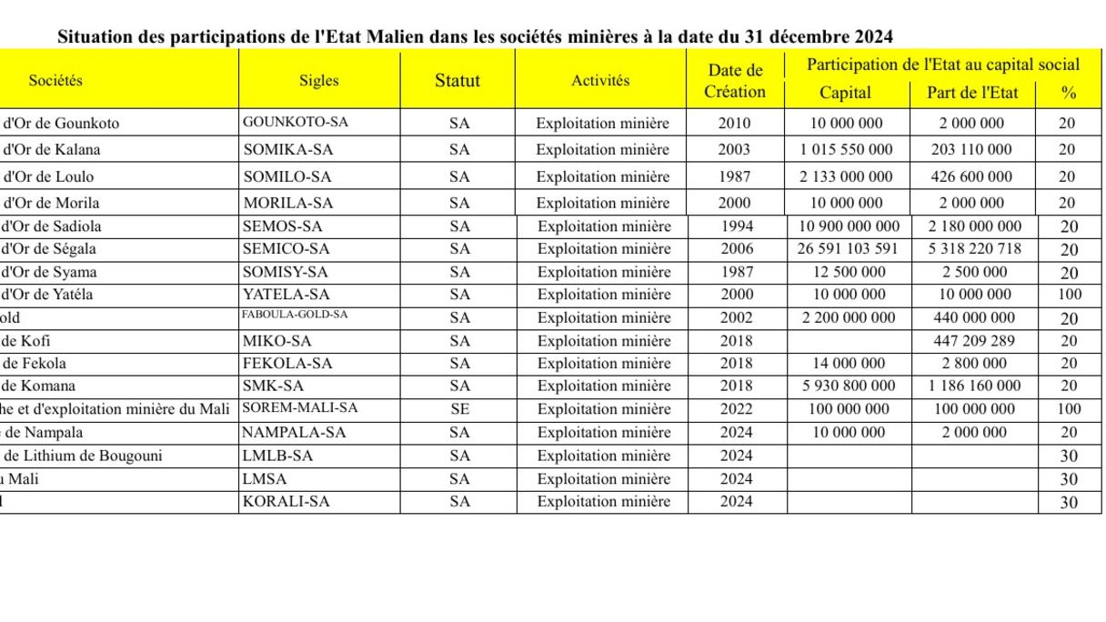 Traditionnellement, comme en témoignent les données officielles de la Direction générale de l’administration des biens de l’État à fin 2024, l’État malien détenait systématiquement 20% du capital dans la quasi-totalité des grandes sociétés minières exploitant l’or industriel (17 au total), à l’image de la Société des Mines d’Or de Sadiola (SEMOS-SA, 20% pour 2,18 milliards F CFA sur 10,9 milliards de capital) ou la Société des Mines d’Or de Loulo (SOMILO-SA, 20% pour 426,6 millions F CFA sur 2,133 milliards).