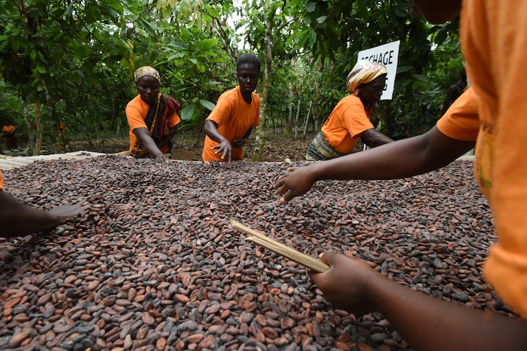 Séchage de fèves de cacao dans une plantation en Côte d'Ivoire: les cacao, pilier de la croissance ivoirienne (+5.5%), mais vulnérabilité aux prix mondiaux et au climat.