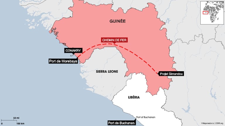Une ligne de chemin de fer de 670 km relie le site de production de Simandou au port de Morebaya, en Basse Guinée.