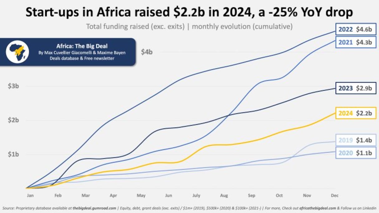 Le bilan du financement des startups africaines en 2024 est désormais connu et révèle un rebond réel mais inégalement réparti. En 2024, les startups africaines ont levé un total de 2,2 milliards de dollars auprès d’investisseurs, selon les données de la plateforme «Africa: The Big Deal». Bien que substantiel en valeur absolue, ce montant représente une baisse de 25% par rapport aux 2,9 milliards levés en 2023, reflétant les effets persistants du ralentissement entamé mi-2022.