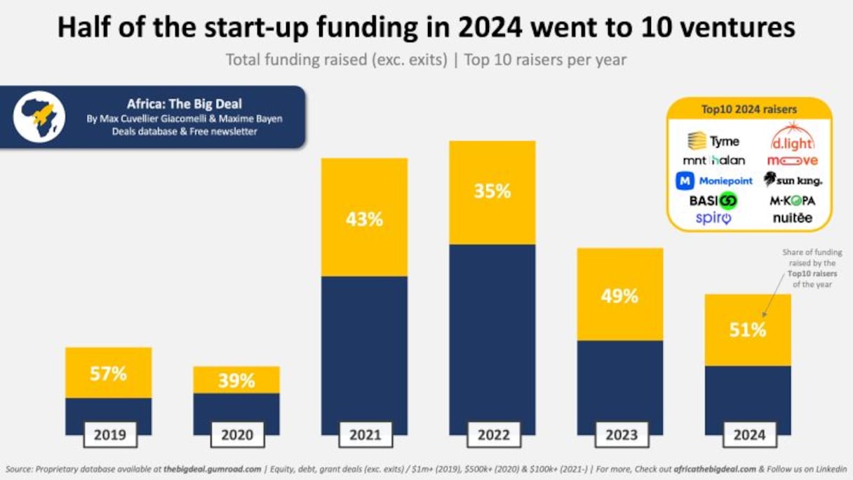 Le financement s’est également concentré sur quelques acteurs : les 10 plus grosses levées de fonds, menées par Tyme, MNT-Halan, Moniepoint, BasiGo, Spiro, D.light, Moove, Sun King, M-KOPA et Nuitée, ont représenté à elles seules 51% des fonds levés sur le continent. Une concentration légèrement accrue puisque ce Top 10 ne pesait que 49% en 2023, 35% en 2022 et 43% en 2021.