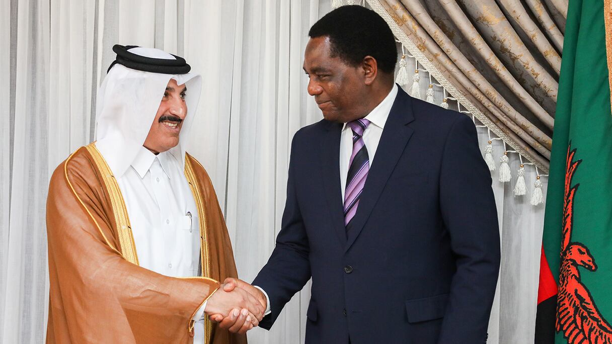 Hakainde Hichilema, président de la Zambie, et Cheikh Mansour bin Jabor Jassim Al Thani, d'Al Mansour Holding. Les investissements programmés devraient atteindre 19 milliards de dollars couvrant 11 domaines économiques dont le pétrole, le gaz, les mines...