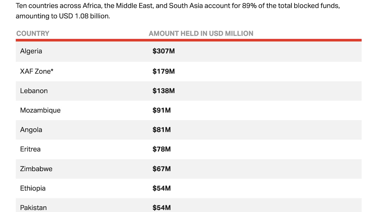 Dans ce classement peu glorieux, l’Algérie devance les pays de la Zone Franc CFA de l’Afrique centrale regroupant six pays (Cameroun, Centrafrique, Tchad, Congo, Guinée équatoriale et Gabon) qui totalisent 179 millions de fonds bloqués. Le trio de tête est complété par le Liban avec 138 millions de dollars de fonds bloqués.