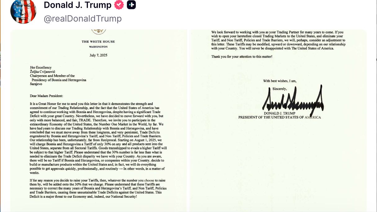 Un modèle des lettres adressées par le président américain Donald Trump aux dirigeants de nombreux pays les enjoignant à signer des accords pour éviter des surtaxes douanières à partir du 1er août 2025.. DR