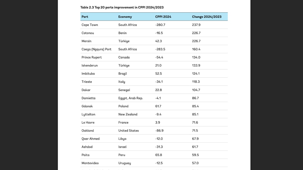 | Rang Afrique | Ports | Pays | CPPI 2024 | Rang Mondial |