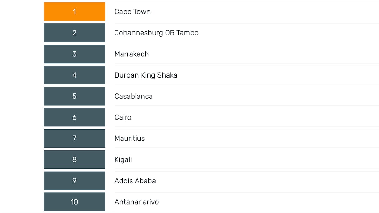 Arrivent en suite les aéroports King Shaka International Airport à Durban d’Afrique du Sud, l’Aéroport Mohammed V de Casablanca (Maroc), Cairo International Airport (Égypte), l’Aéroport international Sir Seewoosagur Ramgoolam (Maurice), l’aéroport international de Kigali (Rwanda), Addis Ababa Bole International Airport (Éthiopie) et l’Aéroport international d’Antananarivo-Ivato (Madagascar).