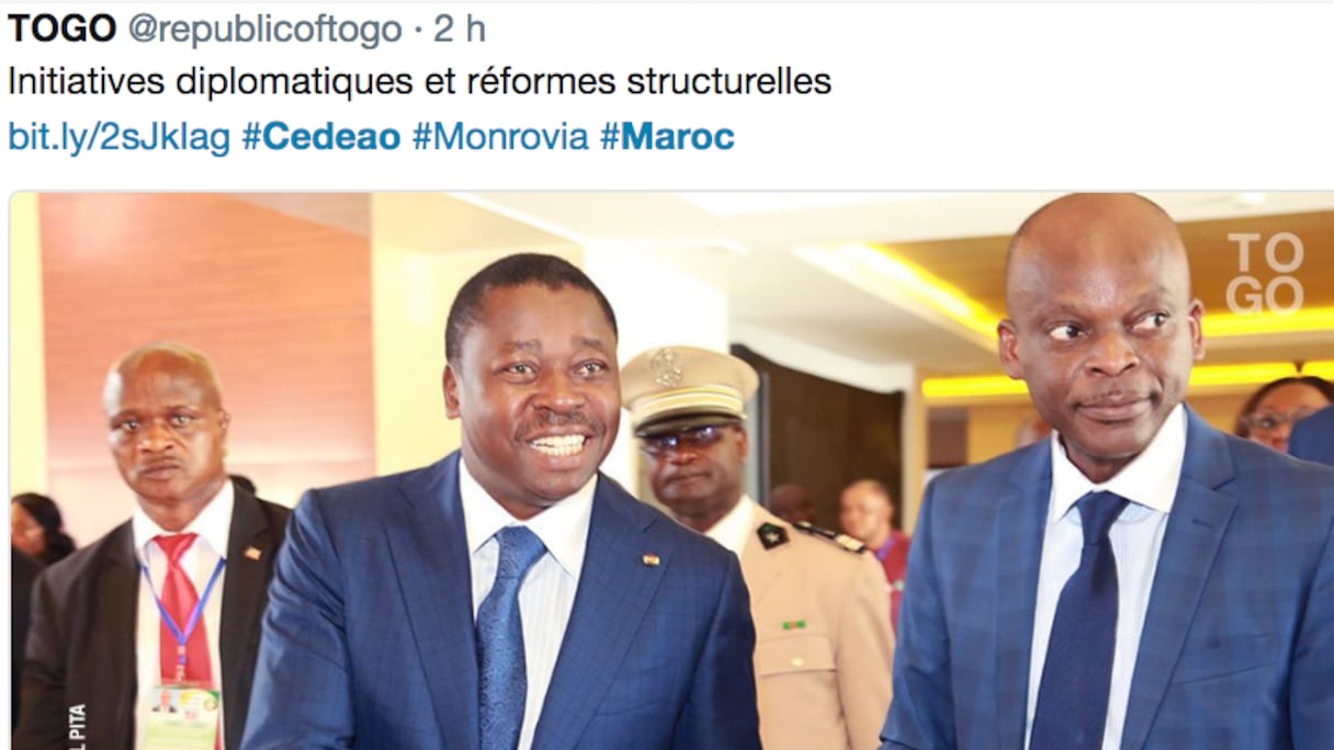 Sans le dire explicitement, pour la présidence de la République togolaise, le Maroc fait désormais partie du projet stratégique de la région ouest du continent. En tout cas, c'est ce que laisse comprendre ce tweet qui annonce l'article: "Initiatives diplomatives et réformes structurelles", ajoutant en commentaires les mots dièses #CEDEAO, #Monronvia et #Maroc. Venant du compte officiel du président togolais, Faure Gnassingbé, par ailleurs président en exercice de la CEDEAO, ce hashtag #Maroc revêt un sens bien particulier.
