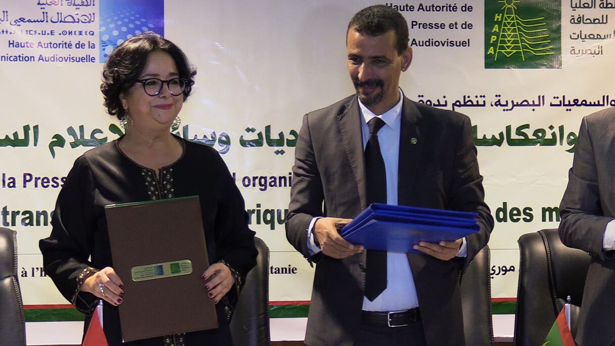 Cette conférence a été organisée en marge de la visite de travail, du 15 au 17 janvier, qu’elle effectue en Mauritanie. À cette occasion, une importante convention de partenariat a été signée entre les deux pays, la Mauritanie ayant été représentée par Houcine Ould Meddou, président de la Haute autorité de la presse et de l’audiovisuel (HAPA).