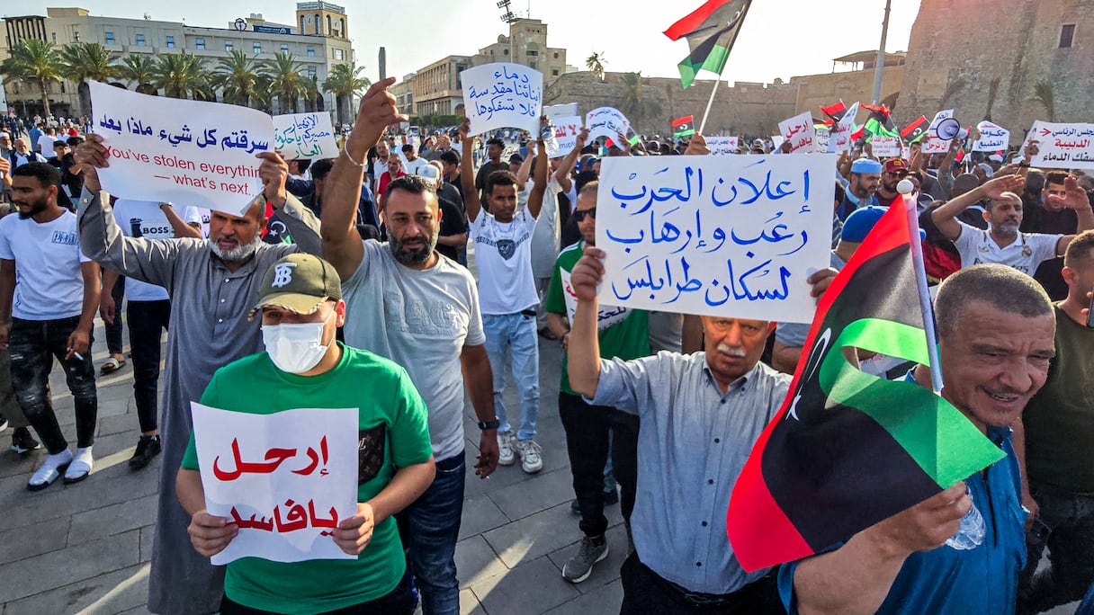 Des protestataires ont réclamé «la fin de toutes les institutions» citant le GNU mis en place sous médiation ONU en 2021 mais aussi le Parlement basé dans l’Est, élu en 2014, la même année que le Haut conseil d’Etat, sorte de Sénat basé à Tripoli.