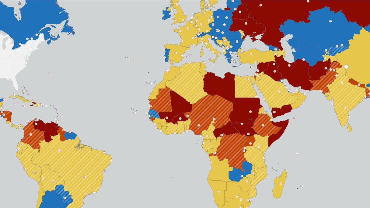 et en rouge foncé (niv 4), les pays où "Ne pas voyager".