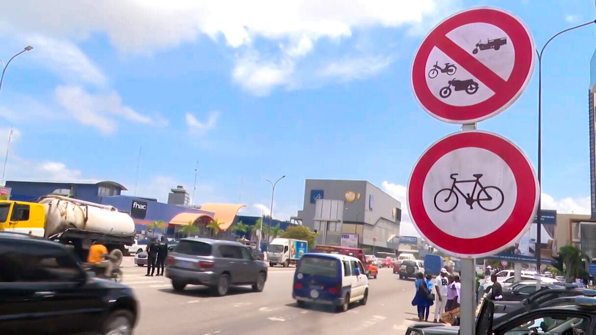 Un panneau indiquant l'interdiction de circulation des motos et tricycles sur le boulevard Félix Houphouët-Boigny d'Abidjan.. le360 Afrique/djidja