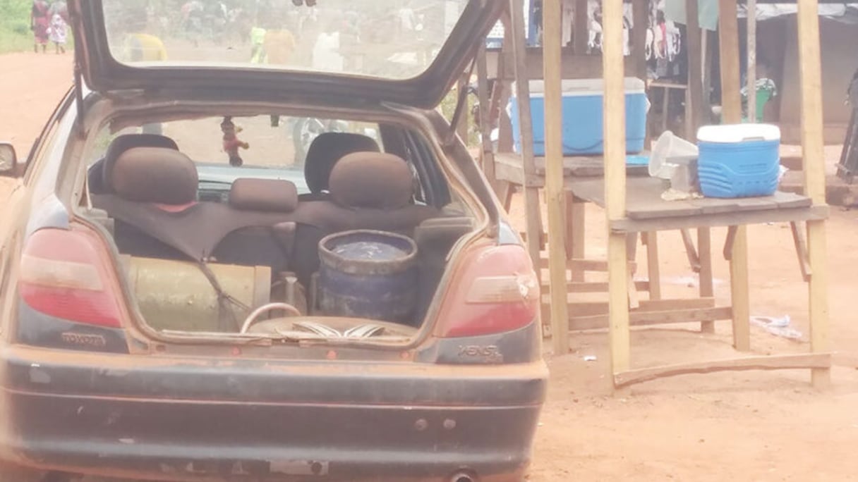 Un taximan en train de faire le plein de butane de manière artisanale.. E. Djidja/Le360 Afrique