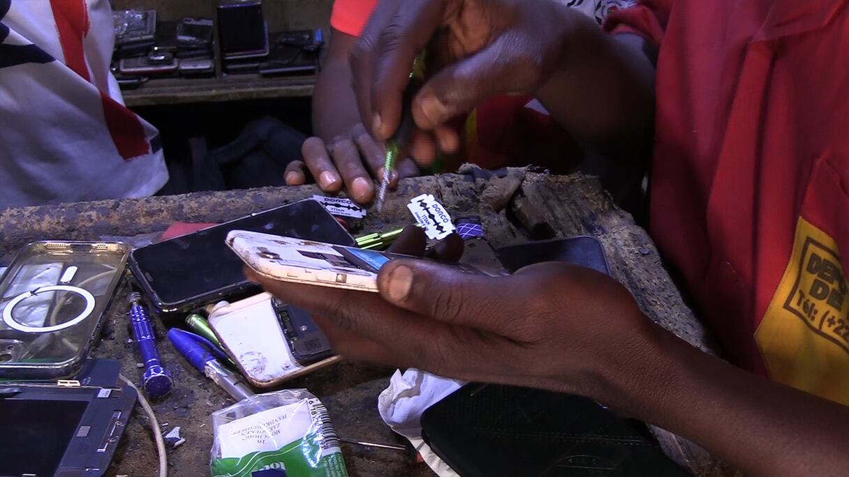 Salif Diarra est un réparateur de téléphone qui s’est installé à ”Vox Da” depuis des dizaines d’années. Il explique que les téléphones qui lui parviennent ont souvent des pannes d’écran, de ruban, de micro ou de port de chargeur.