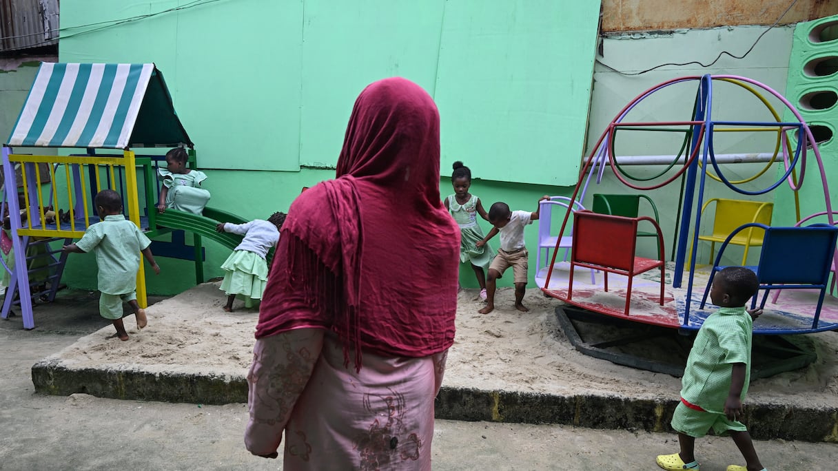 Créée par la direction du marché, la garderie doit «aider les femmes à être plus autonomes», affirme sa responsable, Lucie Djama, qui aimerait avoir davantage de matériel, notamment des jeux éducatifs.