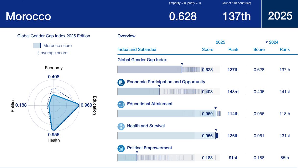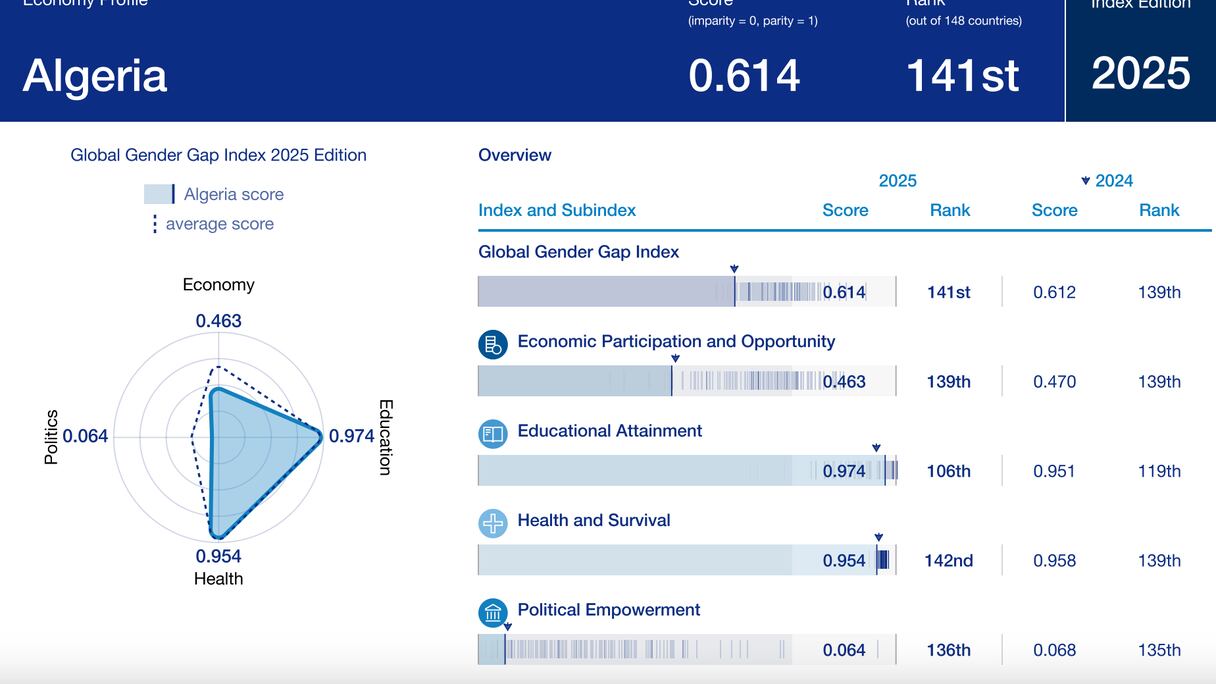 On notera aussi que les pays d’Afrique du Nord sont globalement mal classés en matière d’égalité homme-femme. Ainsi. La Tunisie, la mieux classée de la région, se hisse au 123e rang mondial avec un score de 0,654, devant le Maroc (137e avec un score de 0,628), l’Égypte (139e avec un score de 0,625) et l’Algérie (141e avec un score de 0,614).