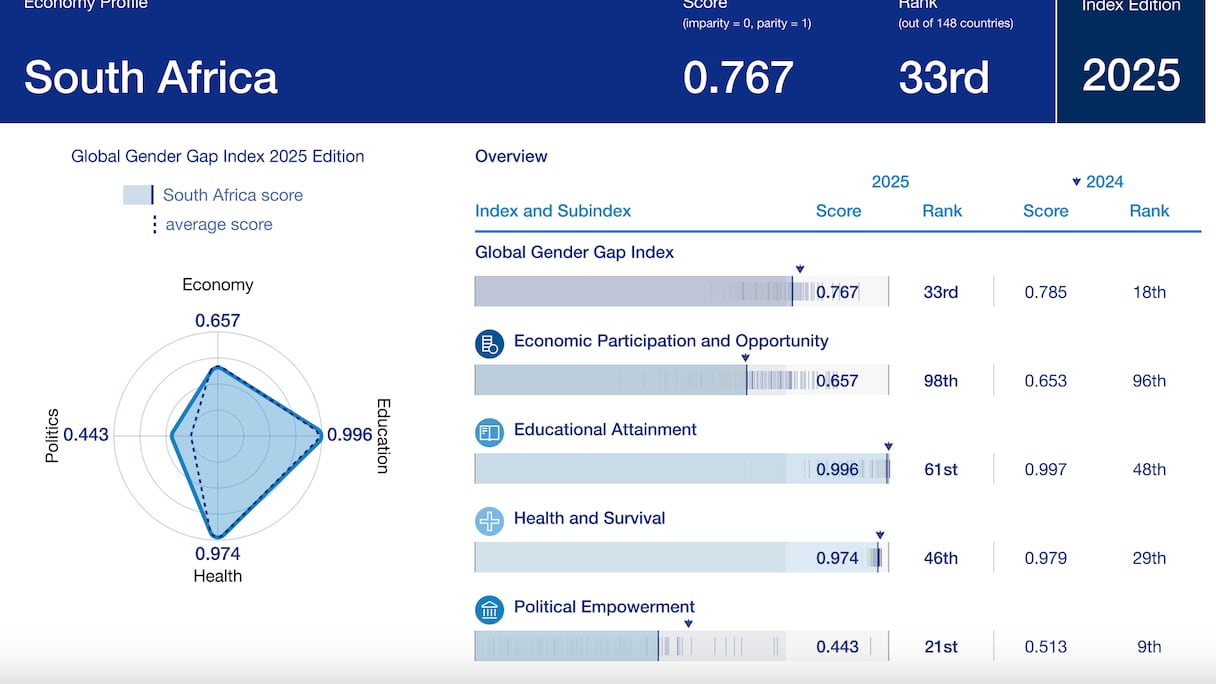 Les résultats de cette année ont été renforcés par les améliorations des scores en matière de parité économique et politique. La Namibie maintient une parité totale en matière de niveau d’instruction pour les hommes et les femmes avec un score de 1, le meilleur au monde. Idem pour ce qui est de la santé et survie pour lequel le pays affiche un score de 0,980.