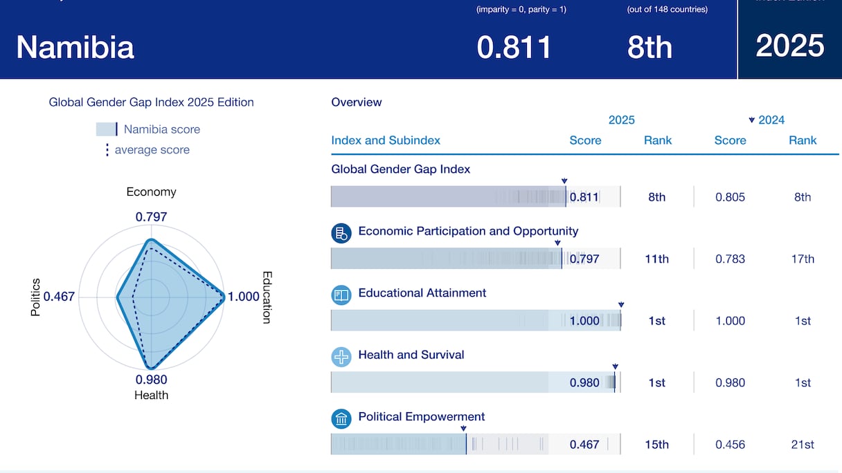 La Namibie occupe le 8e rang mondial sur 148 pays du Global Gender Gap Report du Forum économique mondial avec un score de 0,811. C'est le seul pays africain du Top 10 mondial. La Namibie a réussi à réduire l’écart global entre homme et femme de 81,1%.. DR