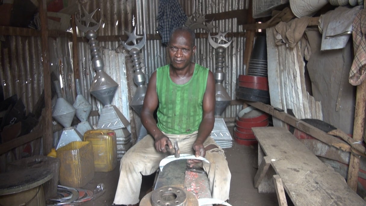Dans son atelier de la T7, entre feuilles d’aluminium, outils usés et étincelles de soudure, Sakamou Bah façonne avec minutie ces symboles qui dominent les mosquées: les croissants de faîtage.