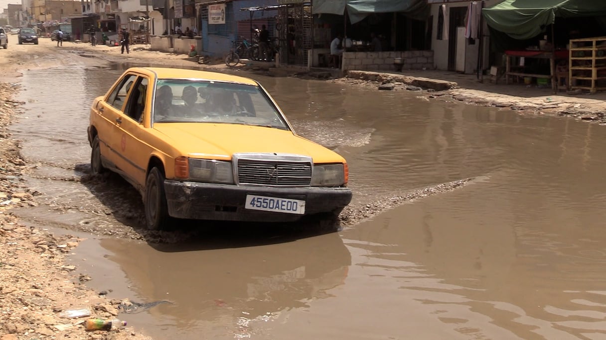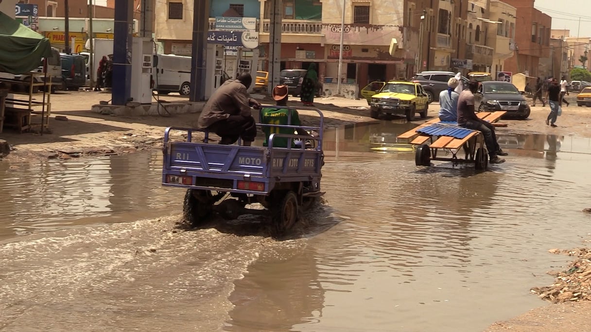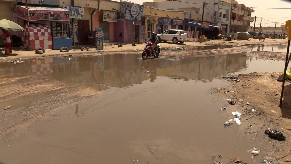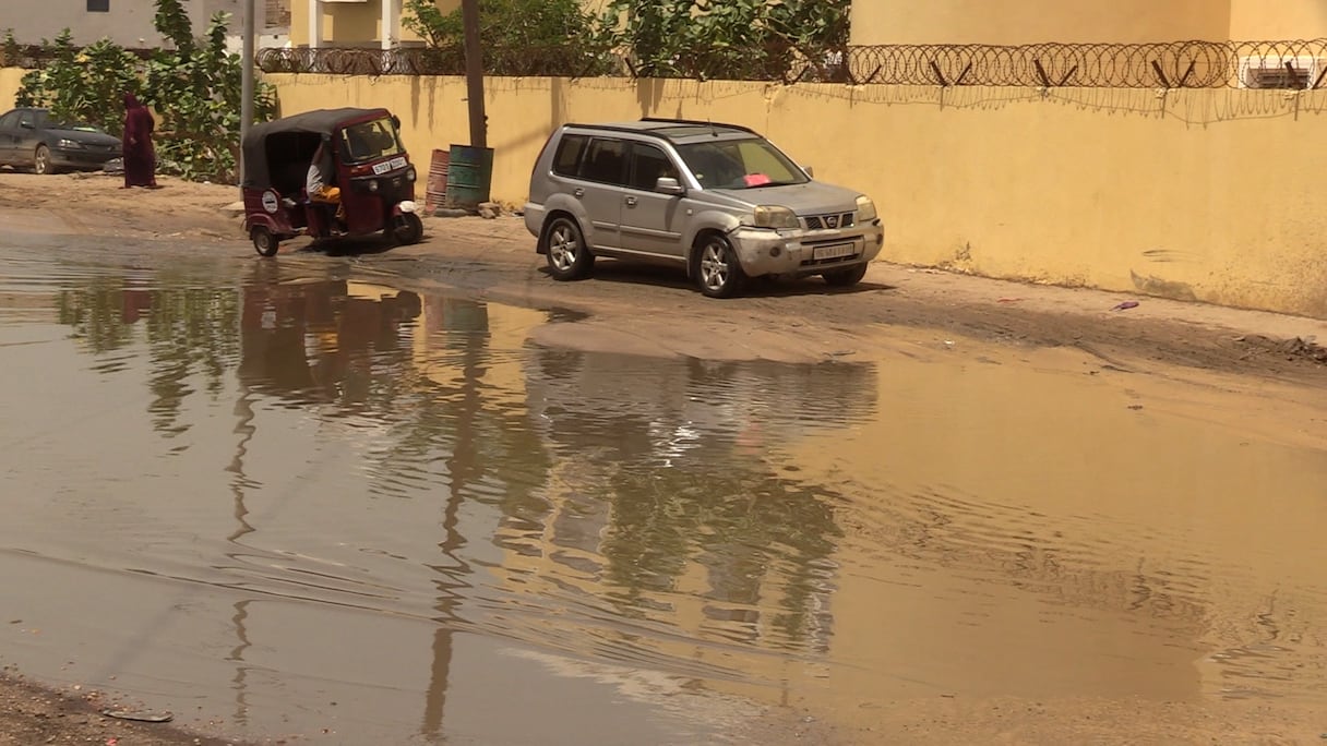 L'eau stagne faute d'égouts et de canaux d'évacuation des eaux de pluies à Nouakchott entrainant des désagréments au niveau de la circulation des personnes et des véhicules. . A. Seck/Le360 Afrique