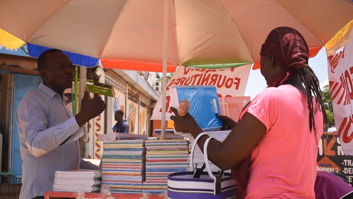 Adama Kabré tient un stand de vente de livres, de sacs à dos et de cahiers. Il décrit le contexte difficile de la rentrée.