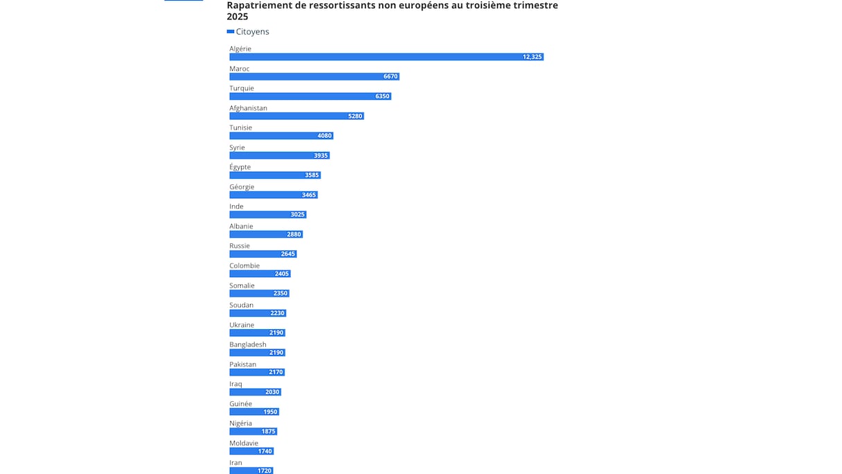 Selon les nationalités, ce sont les Algériens qui sont les plus concernés. Ce sont 12.325 Algériens qui ont été visés par les décisions expulsions au 3e trimestre 2025. Une donnée qui place l’Algérie au cœur des questions migratoires avec l’Union européenne.