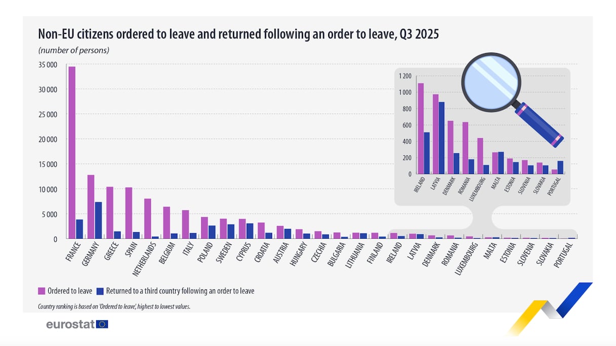 La France est le pays ayant le plus émis de décisions d’expulsion avec près de 33.760 au 3e trimestre 2025, devant l’Allemagne (12.510) et la Grèce (10.175). Toutefois, ces décisions n’ont été exécutées qu’à hauteur de 14% en France, un taux d’exécution à peu près identique à celui de la Grèce (14%), de l’Espagne (13%),…