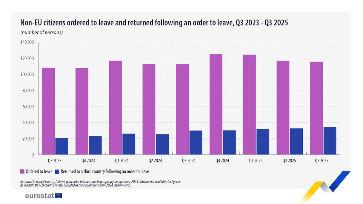 Selon les données de l’Eurostat relatives au troisième trimestre 2025, environ 34.155 personnes en situation irrégulière ont été expulsées vers leurs pays d’origine ou vers des pays tiers. Ce chiffre est en hausse de 14,6% par rapport à la même période de l’année précédente. «La grande majorité (82%) des personnes expulsées ont quitté l’UE, tandis que 18% de ces retours ont été effectués vers d’autres pays de l’UE», selon Eurostat. Sur ce nombre, environ 40% de tous les retours ont été classés comme «forcés».