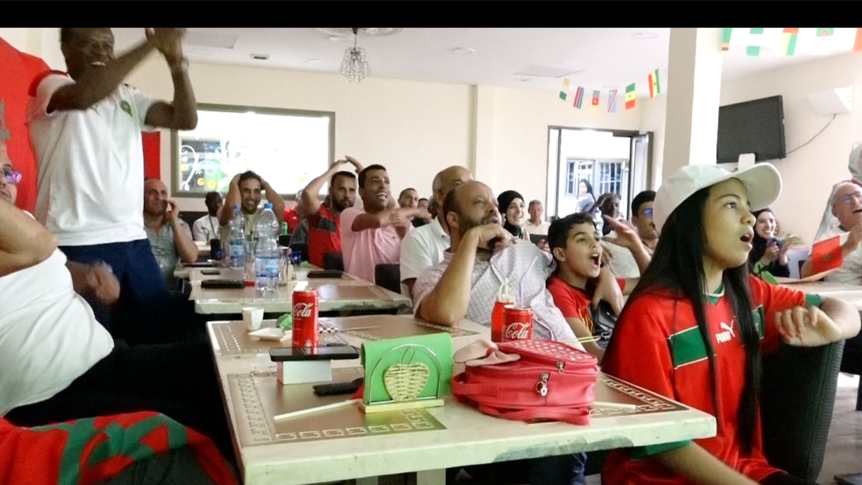 Les Lions de l’Atlas viennent de rugir avec une action sur coup franc de Hakim Ziyech, conclu par Romain Saïss. C’est un dénouement qui augure d’une bonne fin de rencontre pour le jeune Yacine, assis au milieu de ses parents.