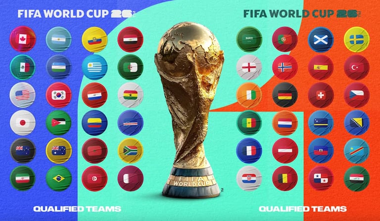 Drapeaux des 48 pays qualifiés à la phase finale de la Coupe du monde 2026 dont 10 africains: Afrique du Sud, Algérie, Cap-Vert, Côte d’Ivoire, Égypte, Ghana, Maroc, RD Congo, Sénégal et Tunisie.
