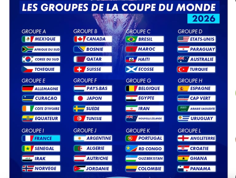 Les 12 groupes de la Coupe du monde 2026. Les 2 premiers de chaque poule et les 8 meilleures 3e sont qualifiés pour les 16ème de finale.