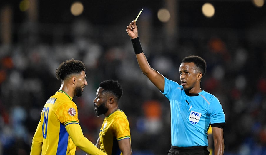 L'attaquant gabonais Denis Bouanga reçoit un carton lors du match contre la Côte d'Ivoire au Grand Stade de Marrakech le 31 décembre 2025 AFP